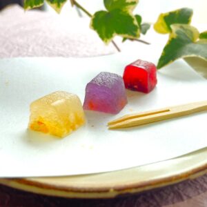 琥珀糖は江戸時代からある日本の伝統的なお菓子です。ティータイムに最適で、茶道の一部として提供されることもよくあります。 外側はカリカリ、内側はゼリーのようなぷるっとした食感です。