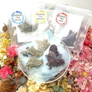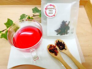 ハイビスカスとローズヒップの赤いハーブティーです。ビタミンCが豊富に含まれています。ハーブティーは赤の他、青(レモングラス・バタフライピー)と黄色(エルダーフラワー・ジャーマンカモミール)もご用意しています。 -