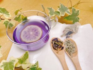 ハーブティーにドライフルーツを入れると、爽やかでフルーティーな味わいを楽しめます。また青色のハーブティーはレモンなどの柑橘類を入れると色が紫色に変化するのを楽しめます。