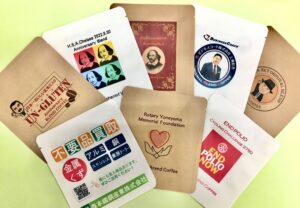 ドリップ用のコーヒー袋はオリジナルデザインを作成することも可能!顔写真や似顔絵をデザインに入れたり、会社の広告やイベント案内をデザインすることもできます。