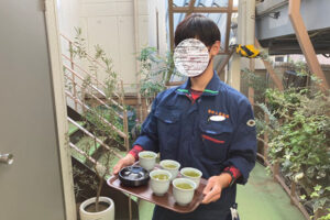 来客者の方向けにお茶だしを実践してもらい、席次や入退出のマナー、順序を学んでいただきました。自己紹介までやらせてもらうことができ、学校生活では経験できない社会人ならではの業務を体験出来たと思います -