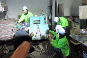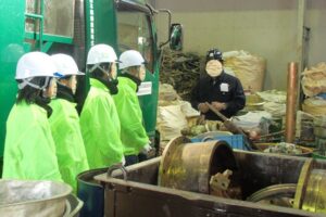 製品がどのように加工処理しているのかを機械を見ながら説明して頂きました。スクラップ業ならではの機械をメインに生産者よりお話がありました。