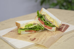 具沢山サンドイッチ 栄養価の高いウズラの卵をたっぷり使用したサンドイッチ。 なんといってもこのボリューム感! ひと切れで充分食べ応えがあり、ランチにお勧めの商品です。 -